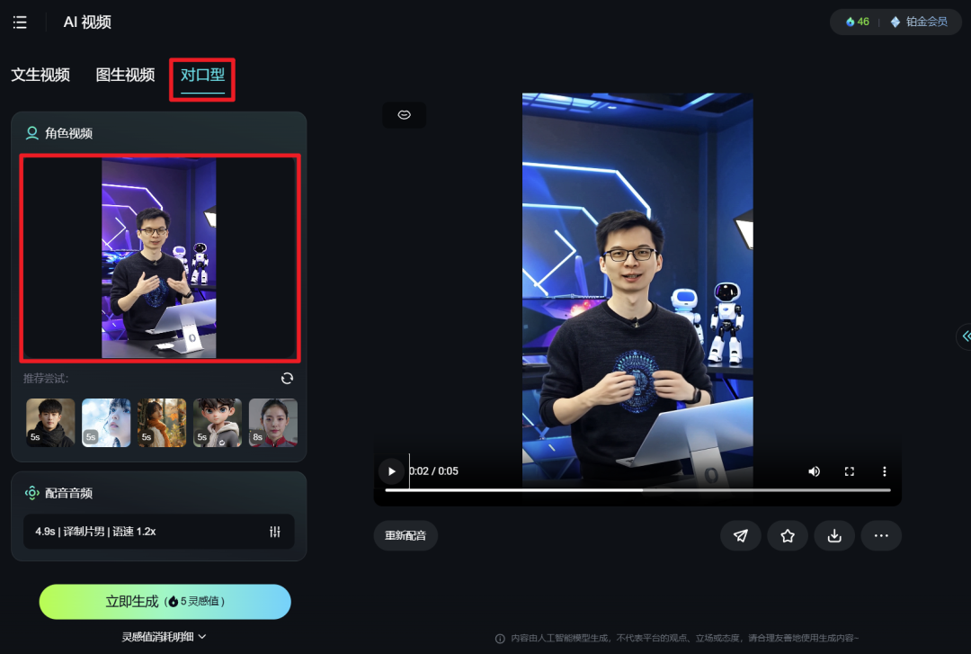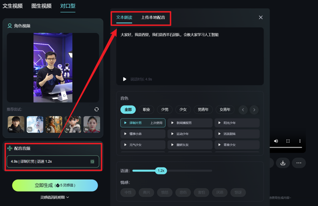 我们能上传一段本人的音频,全体画面气概若何”等。我们能够操纵这个视频进行后期的对口型操做。就间接选择“羊羊”,难以达到取本人声音一模一样的结果。正在左边上传视频,